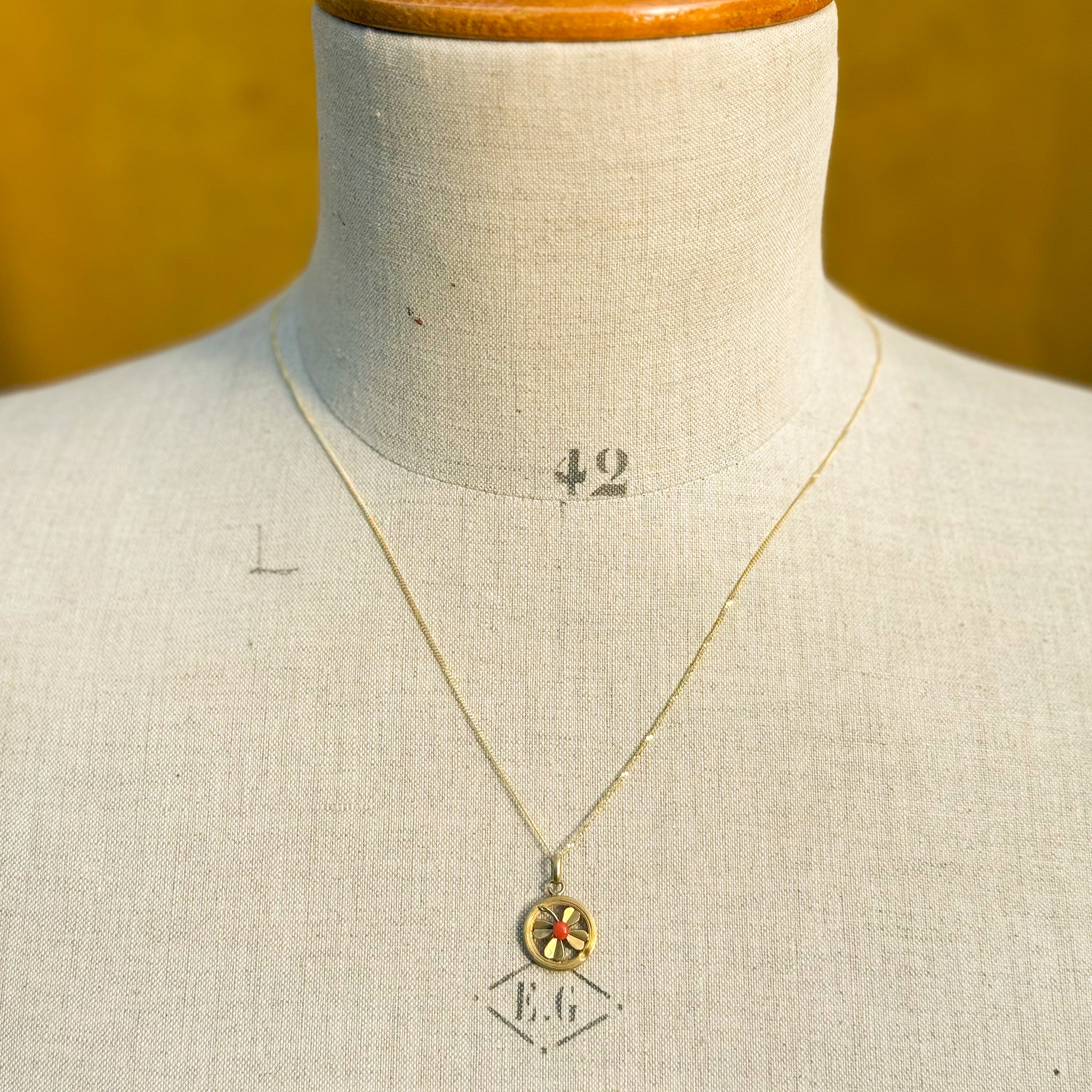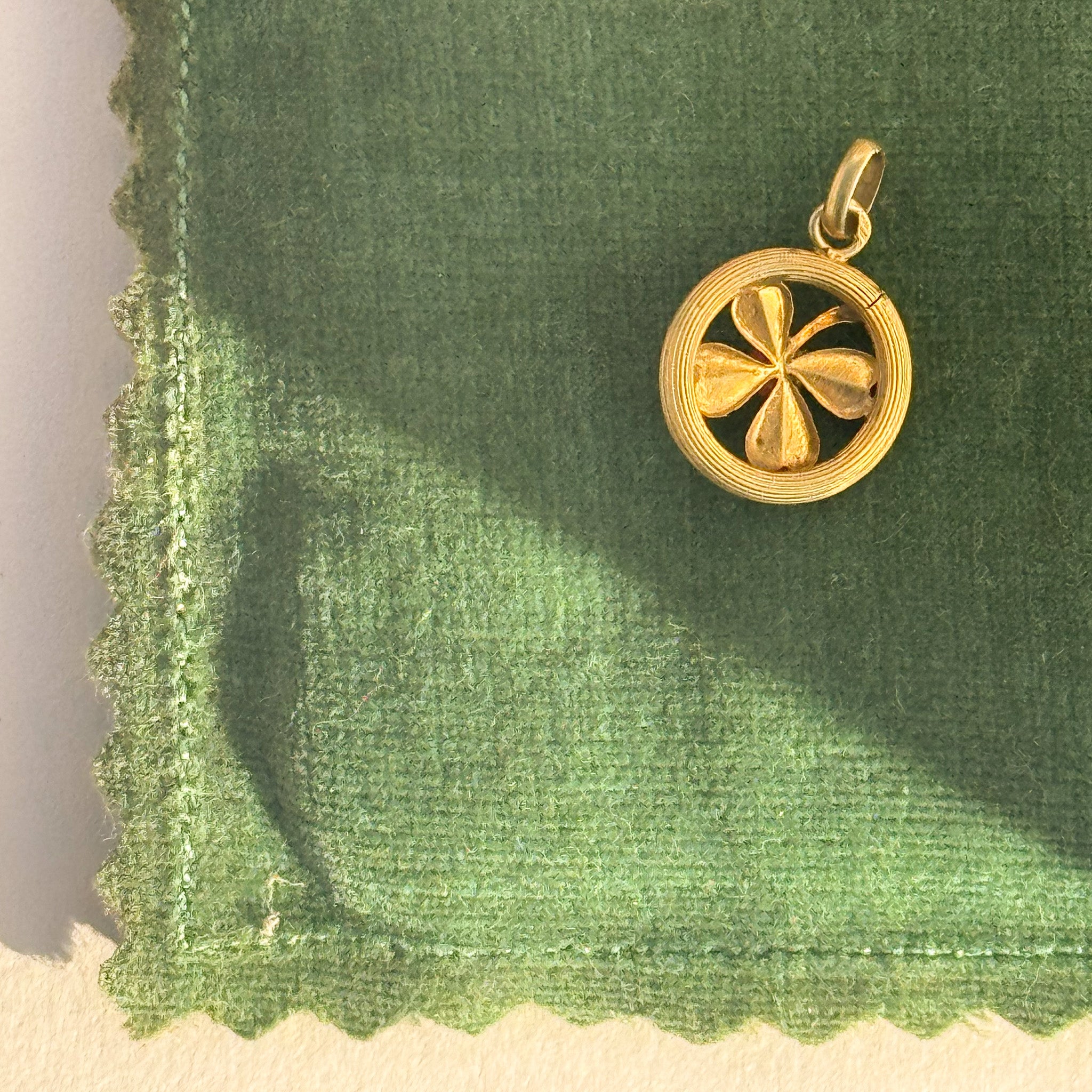 A joyful lucky clover charm created in 15ct gold with a central coral bead.