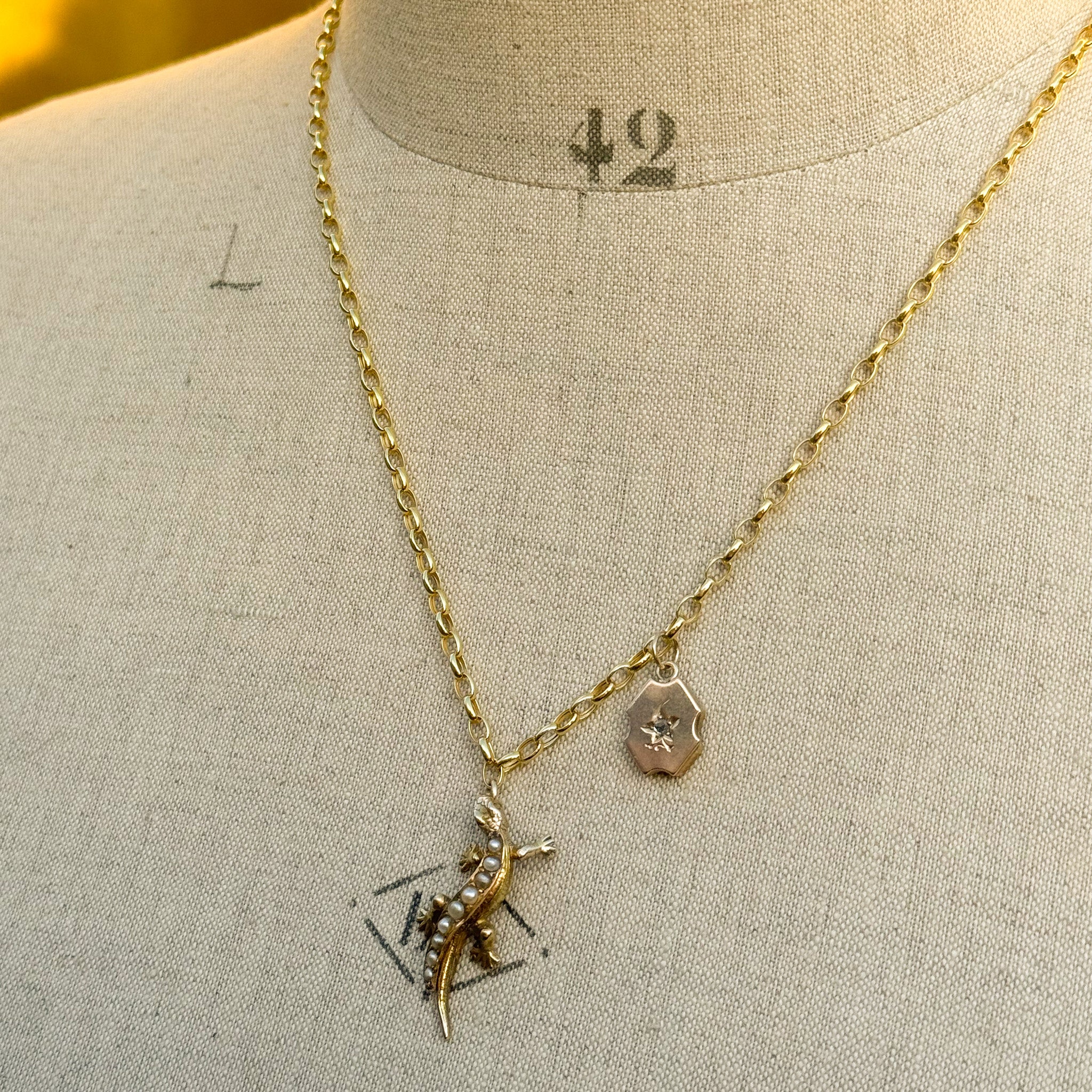 A luscious, lucky antique lizard! Dating to around the Victorian period, Lizards were a well loved motif known to bring good fortune. Created in 9ct gold with a swooping set of pearls running down its back, he’s certainly a real head turner.