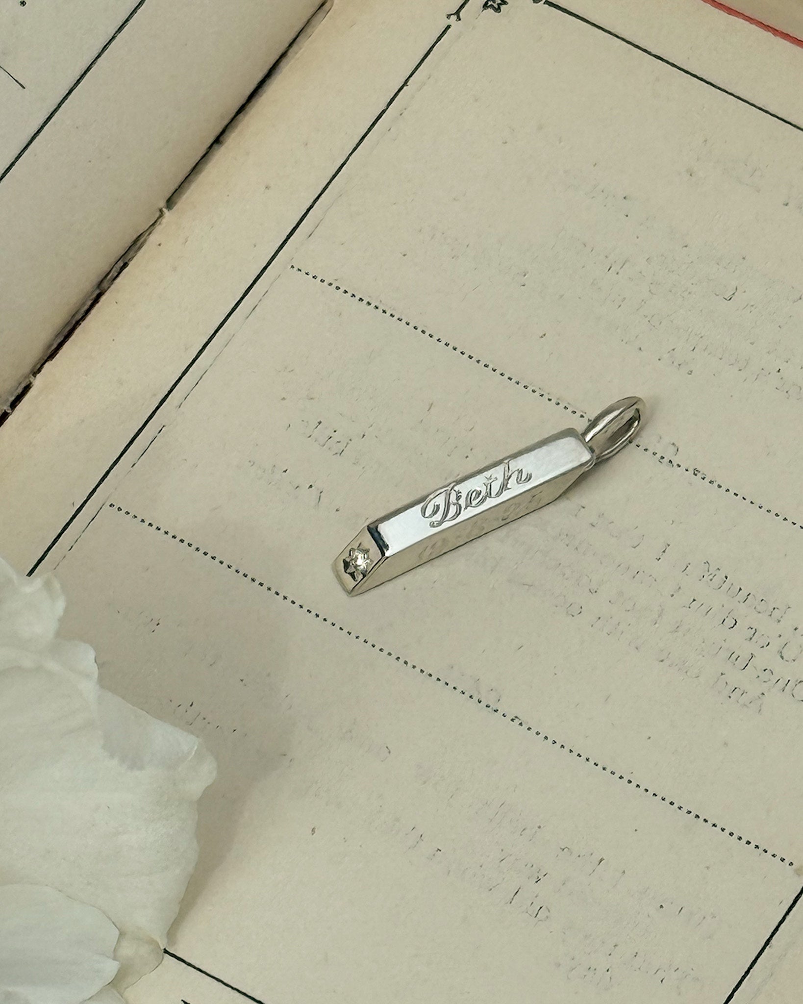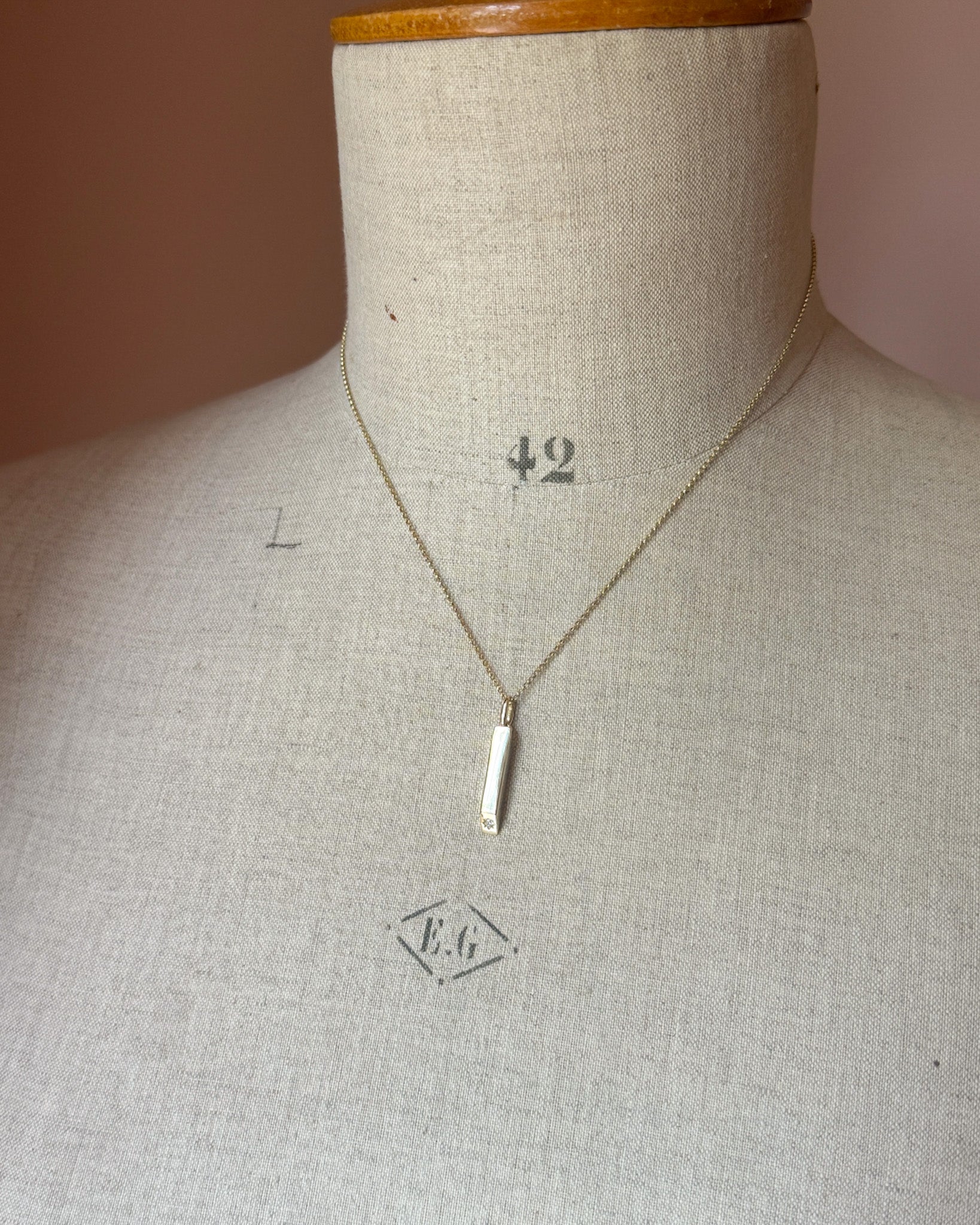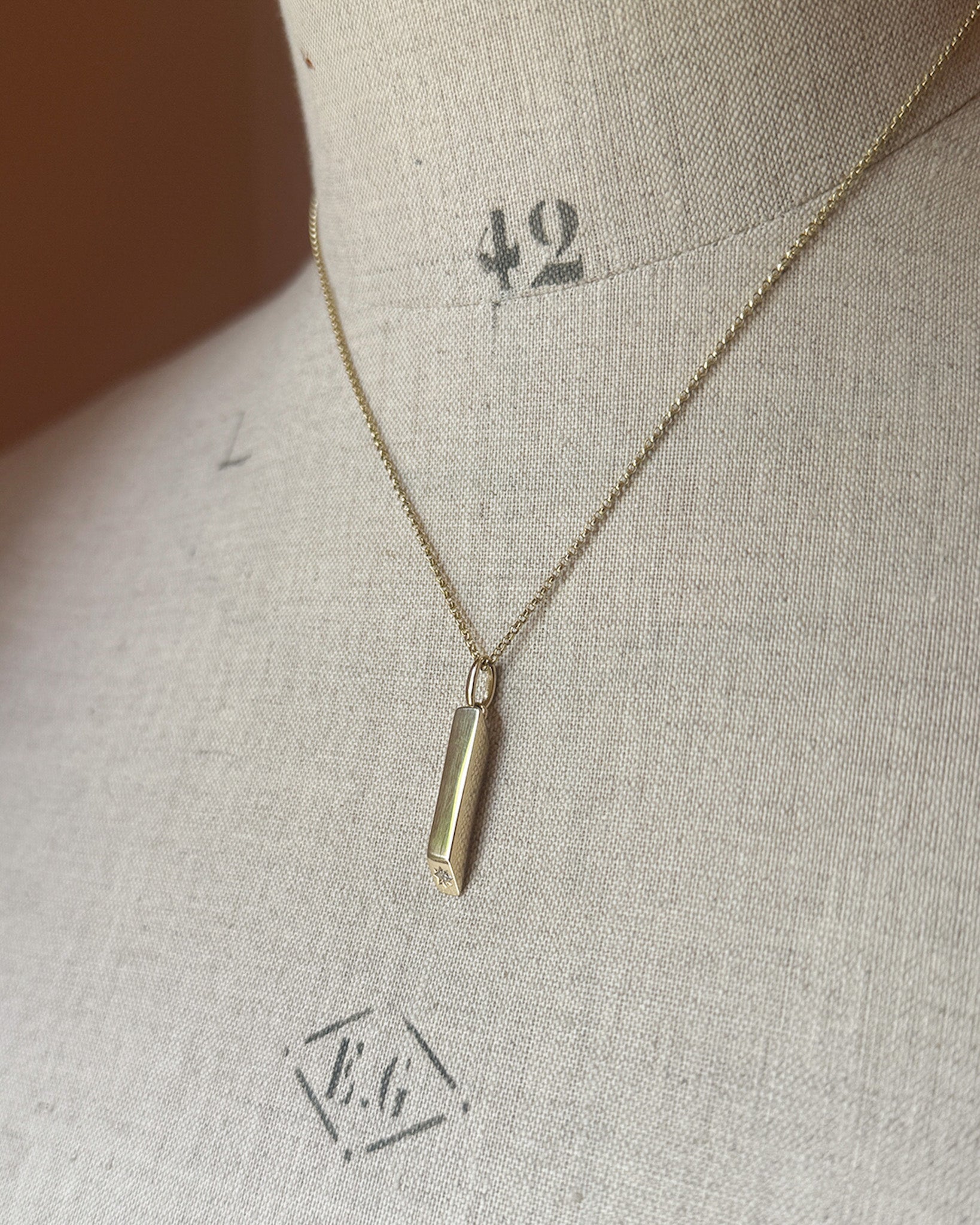 Inspired by an antique cufflink we restored this summer, the Heirloom Bar pendant carries the quiet charm of history reimagined. Its solid form now holds a soft rose-cut diamond star at its base — a detail that catches the light in the most beautiful, understated way.