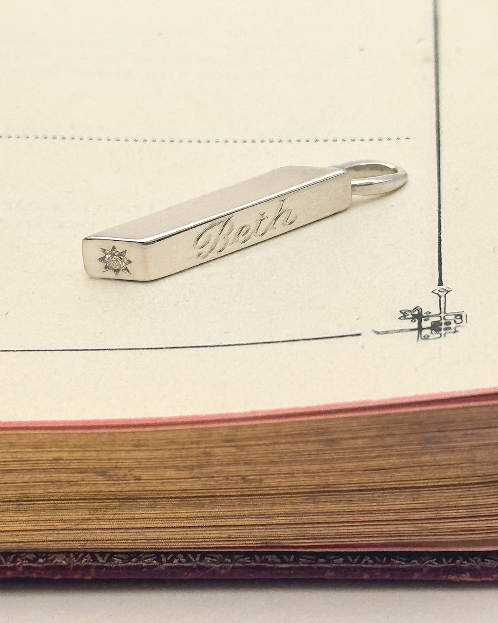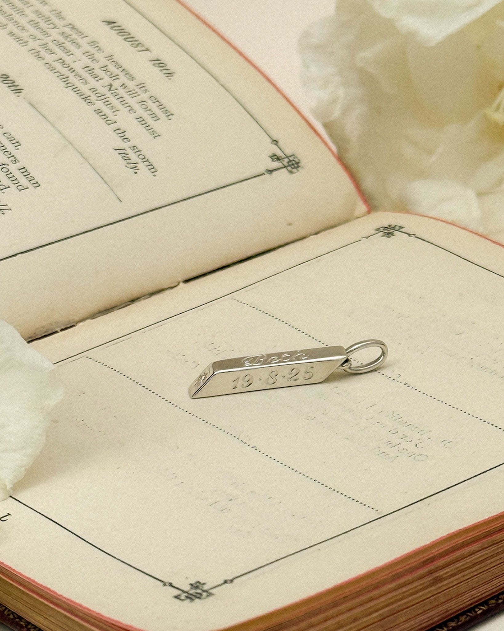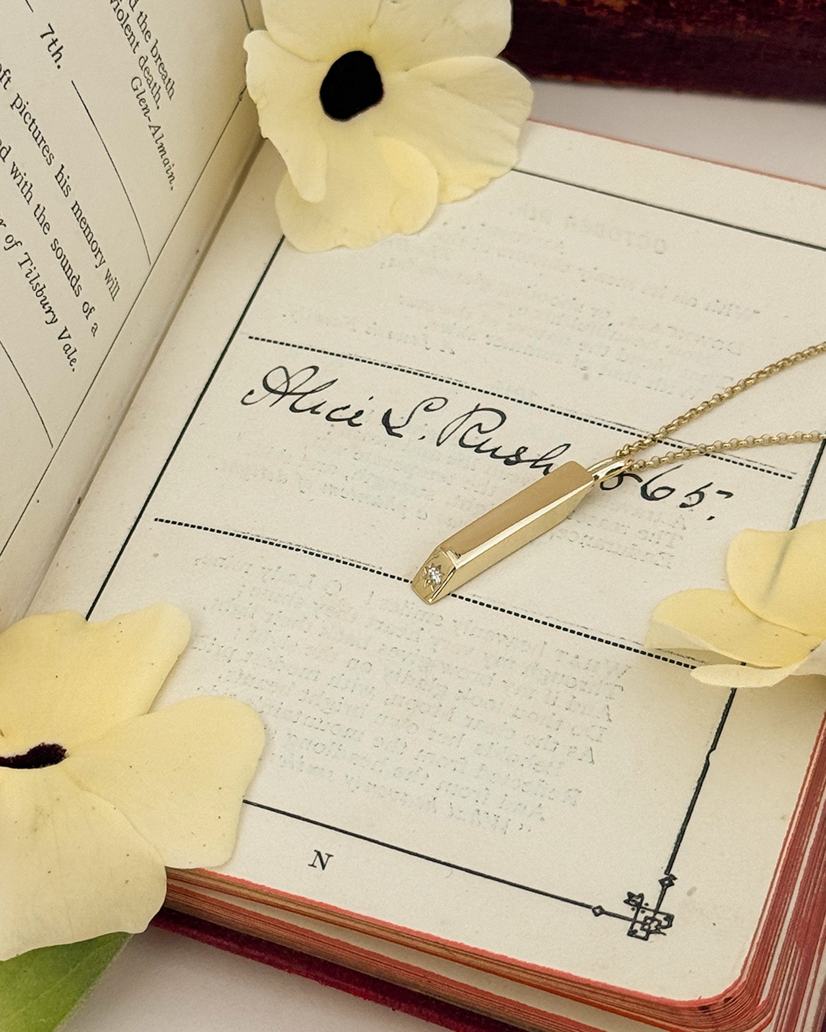 Inspired by an antique cufflink we restored this summer, the Heirloom Bar pendant carries the quiet charm of history reimagined. Its solid form now holds a soft rose-cut diamond star at its base — a detail that catches the light in the most beautiful, understated way.