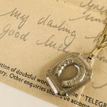 This is such a brilliantly unique locket. Created in a lovely soft pale yellow hue of 9ct gold, the locket features a lucky horseshoe on the front with ‘Good Luck’ and screw details to each corner. On the reverse there’s a shield encased in a lovely sweeping flower pattern.
