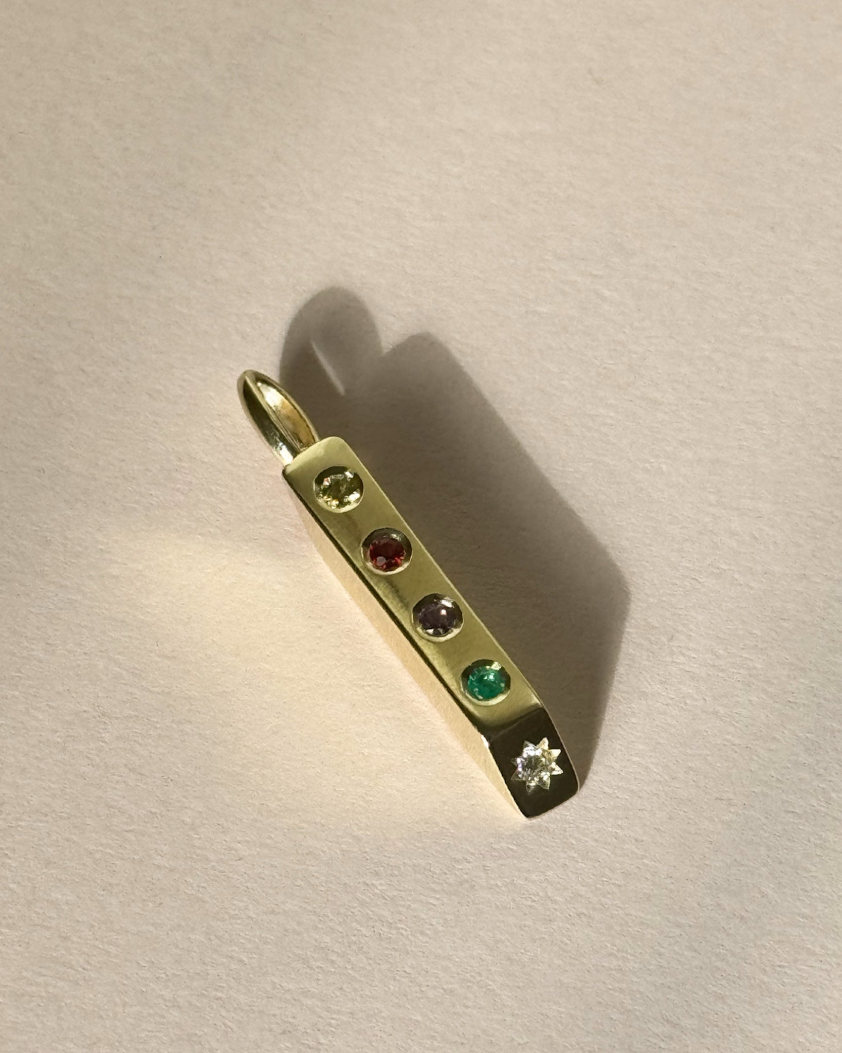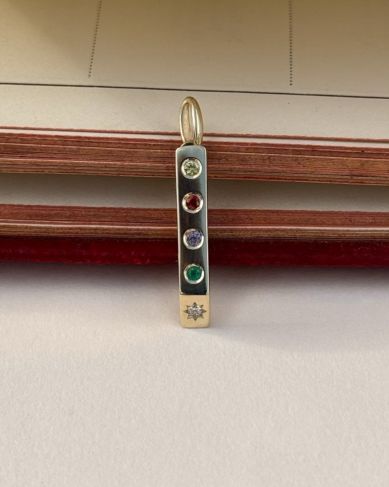 Inspired by the secretive language of Victorian acrostic jewellery, this pendant spells out a secretive message using the first letter of the stones.
