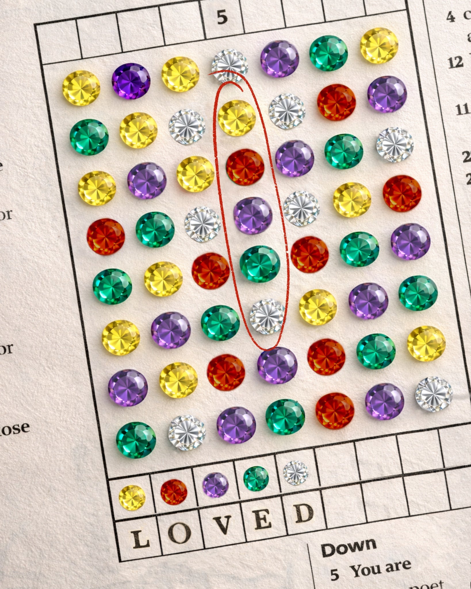 (L)emon sapphire, (O)range sapphire, (V)iolet sapphire, (E)merald, and completed with a star set (D)iamond at the bottom.