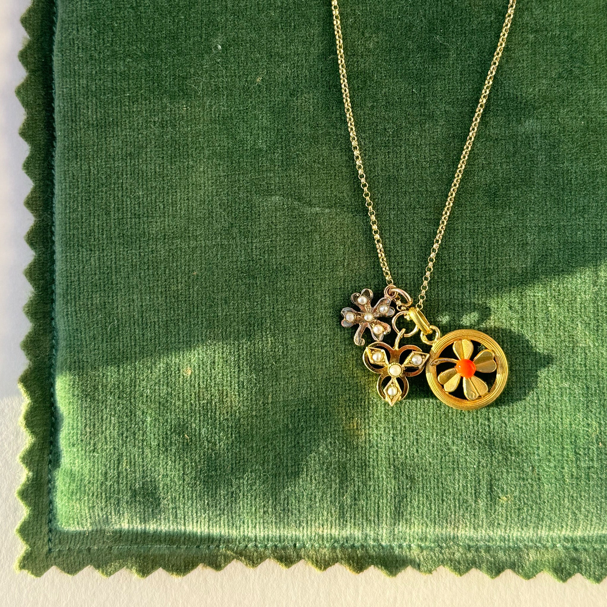 We teamed these lovely vintage and antique clover charms together to bring you a trio of luck all in one necklace. With a great mix of scale and a colour combo of pearl and coral these charms make the perfect pairing.