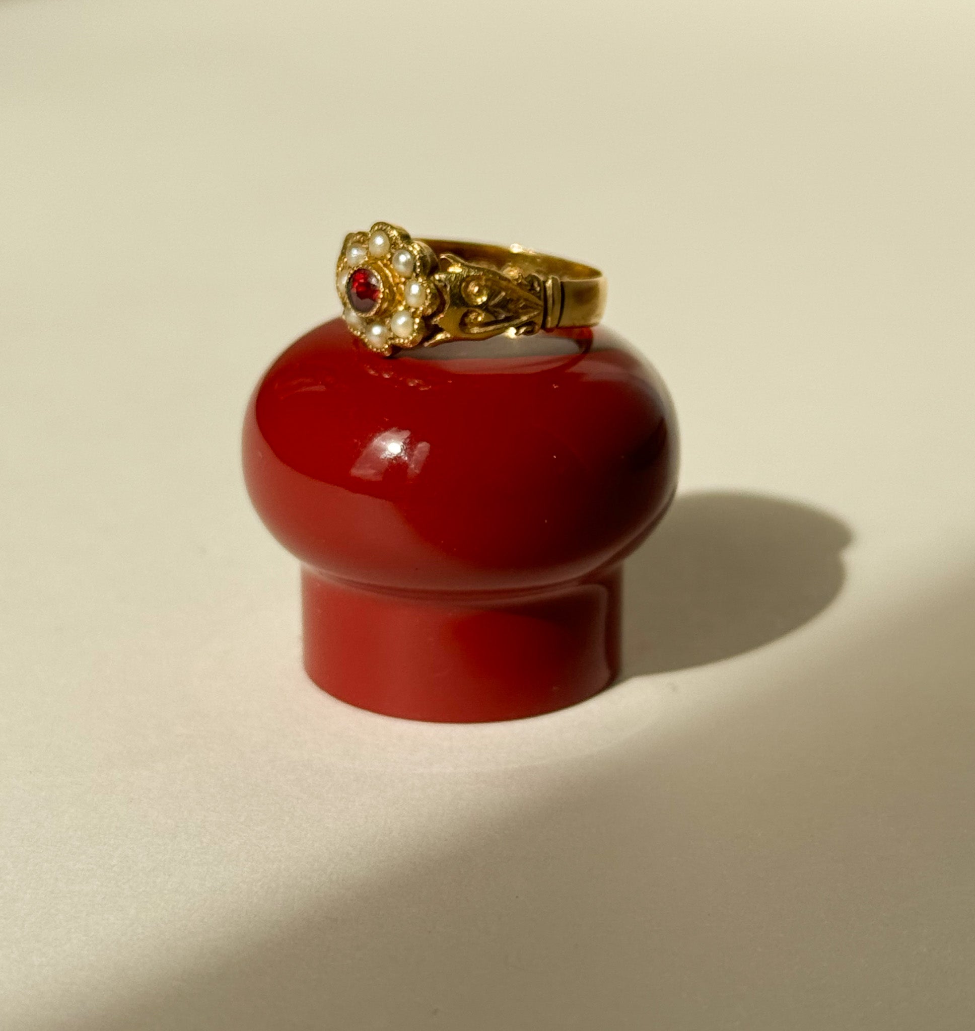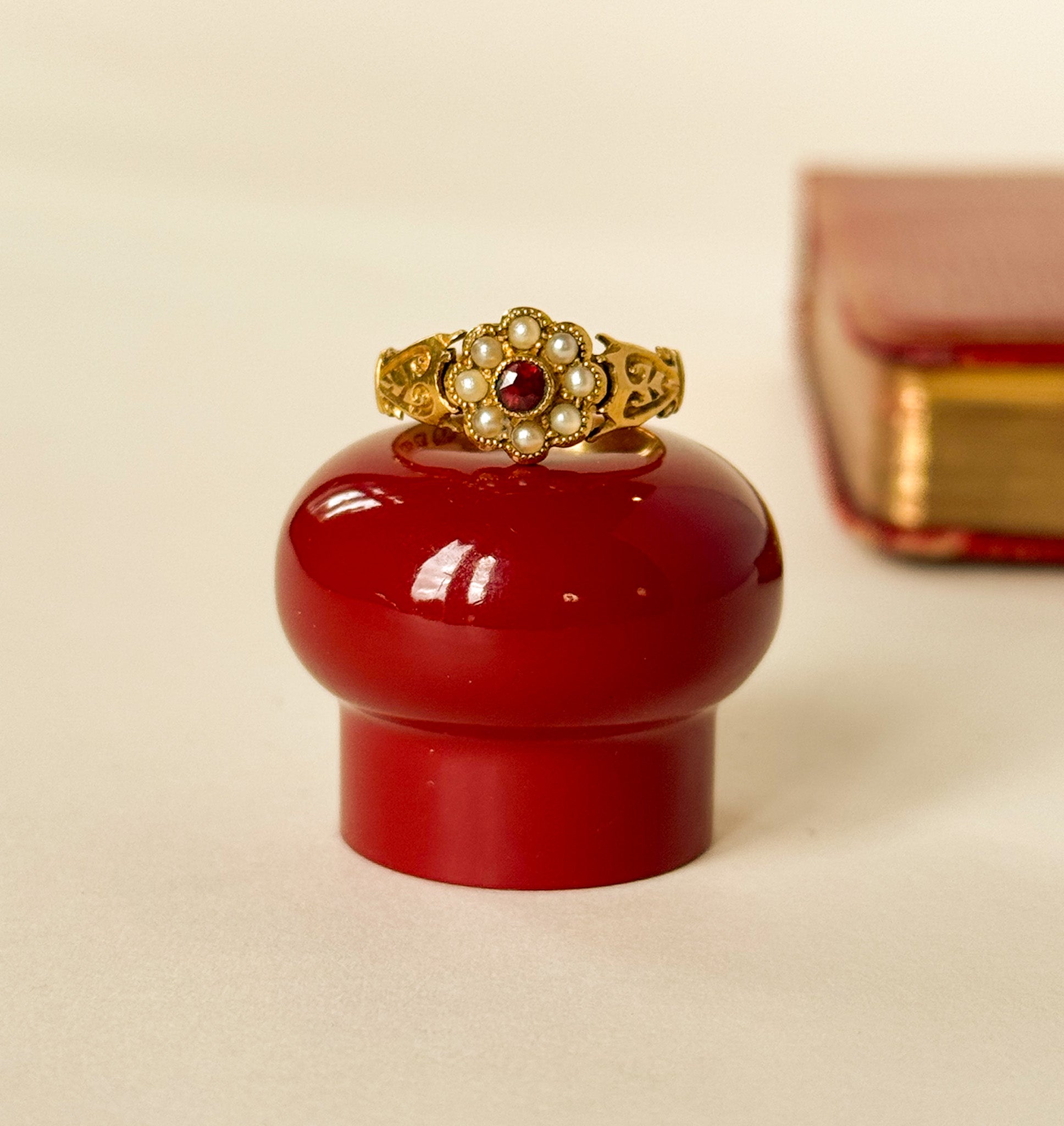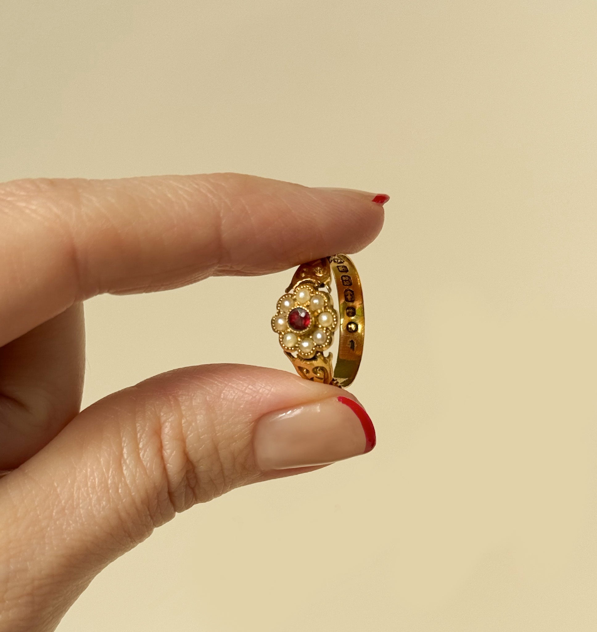 Featuring a central flower design with seed pearls and a faceted ruby. The shoulders have a unique cut out design and stylised hearts. The back of shank has a lovely substantial width to it also.